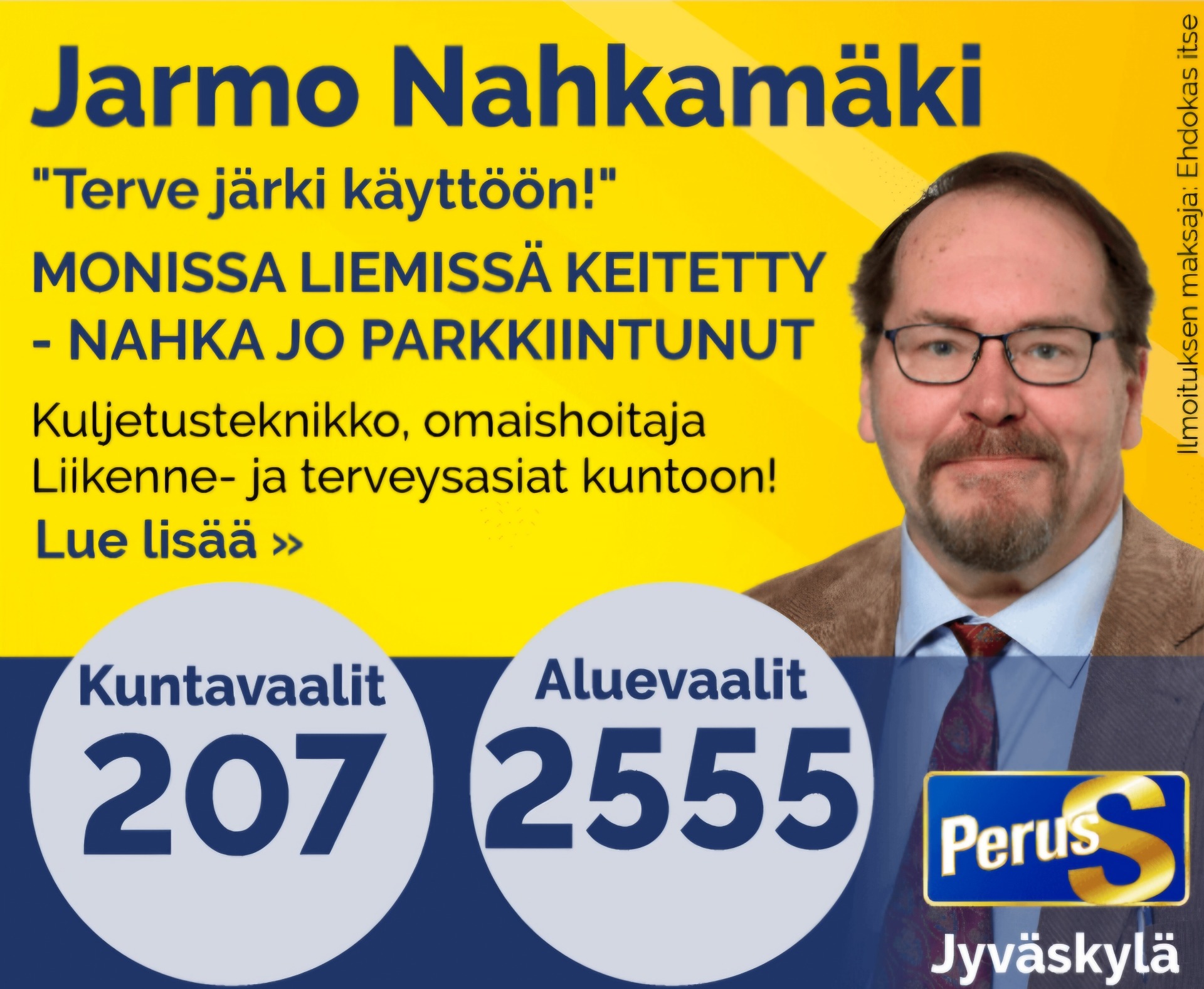 Olen ollut Perussuomalaisten puheenjohtaja Jyväskylässä 4 vuotta vuosina 2018-2021 ja Perussuomalaisissa vuodesta 2011 asti. Olen valmistunut yo-kuljetusteknikoksi vuonna 1988. Harrastuksenani on autoilu ja video- sekä valokuvaus. Asun Myllyjärvellä. Parhaiten mielipiteistäni pääset selville seuraamalla Uuden Suomen Puheenvuoron blogikirjoituksiani - niitä on jo 1150 kappaletta. Linkistä: https://puheenvuoro.uusisuomi.fi/author/jarmonahkamaki/